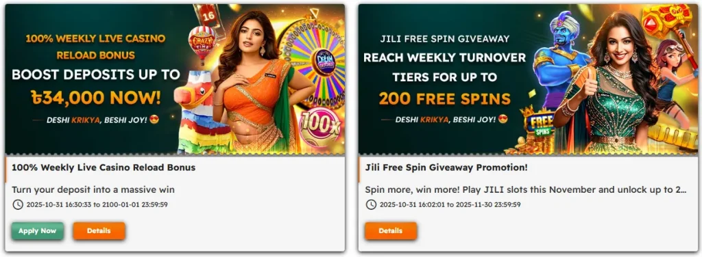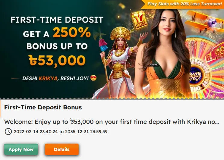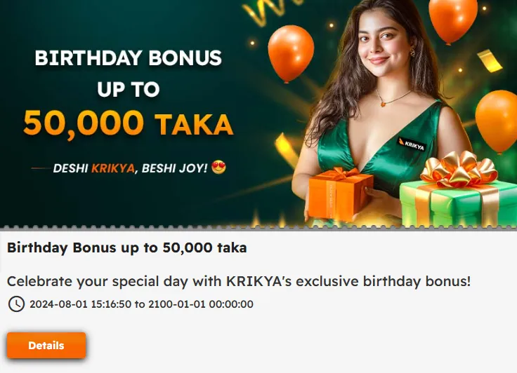 The Krikya app and mobile site show all active promotions in a dedicated “Promotions” or “Bonus” section. While exact percentages and amounts can change, most reviews highlight several consistent bonus types for Bangladeshi users: