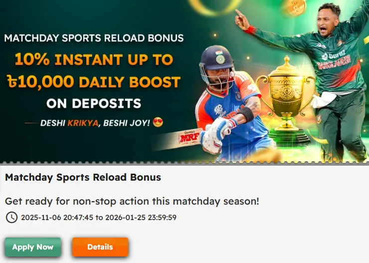 Independent reviews describe a standard model where new customers receive a matched bonus on their first deposit, with separate offers for casino and sports betting. For casino, the site typically credits a percentage of the initial deposit up to a fixed amount in BDT, usable on slots and selected casino games, subject to wagering. For sports, the welcome package usually acts as a free bet or extra credit that must be turned over on qualifying bets with minimum odds before becoming withdrawable cash.